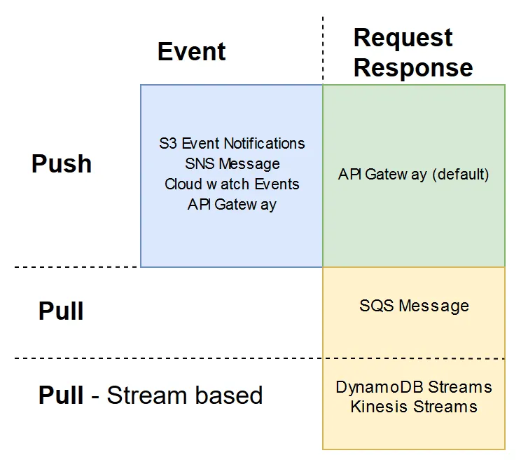 - Pull: an AWS managed Lambda polls data from another service and sends the information to Lambda.