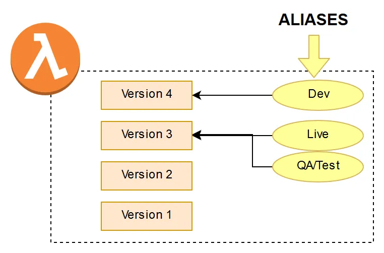 There are three ways in which you can use versioning and aliases. A single Lambda function that gets a new version number whenever there is a change to code or configuration. The alias will be used as the stage and pointed to the correct version of the Lambda function.