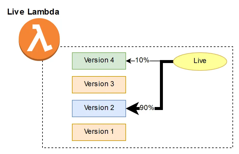 The second method that comes to mind is a blue green deployment. Which is a little less complex where you would have three different Lambdas, one for each stage—blue being the old version and green being the new version. Just like before each new deployment of a Lambda is versioned. Then when you are ready to make the new code changes live, you create an alias that specifies, for example, 90% of traffic uses the old version and then 10% of the requests go to the new version. This is called Canary Deployments, although AWS doesn’t label it as such, it allows you to gradually shift traffic to the new version.