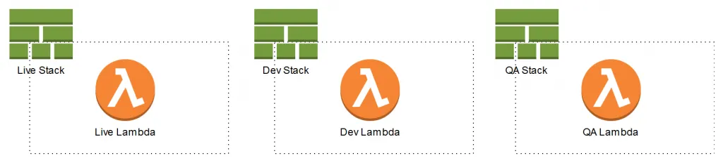 The third method is the simplest and plays nicely with IaC (Infrastructure as Code) tools like CloudFormation, SAM and CICD (Continuous Integration Continuous Deployment) pipelines. It’s based on the principle that each Lambda is “tightly” coupled with its environment/infrastructure. The whole environment and Lambda are deployed together, any rollback will mean that a previous version of the infrastructure and Lambda needs to be deployed again. This offloads the responsibility of versioning to the IaC tool being used. Each Lambda function name includes the stage and is deployed as a whole, with the infrastructure.