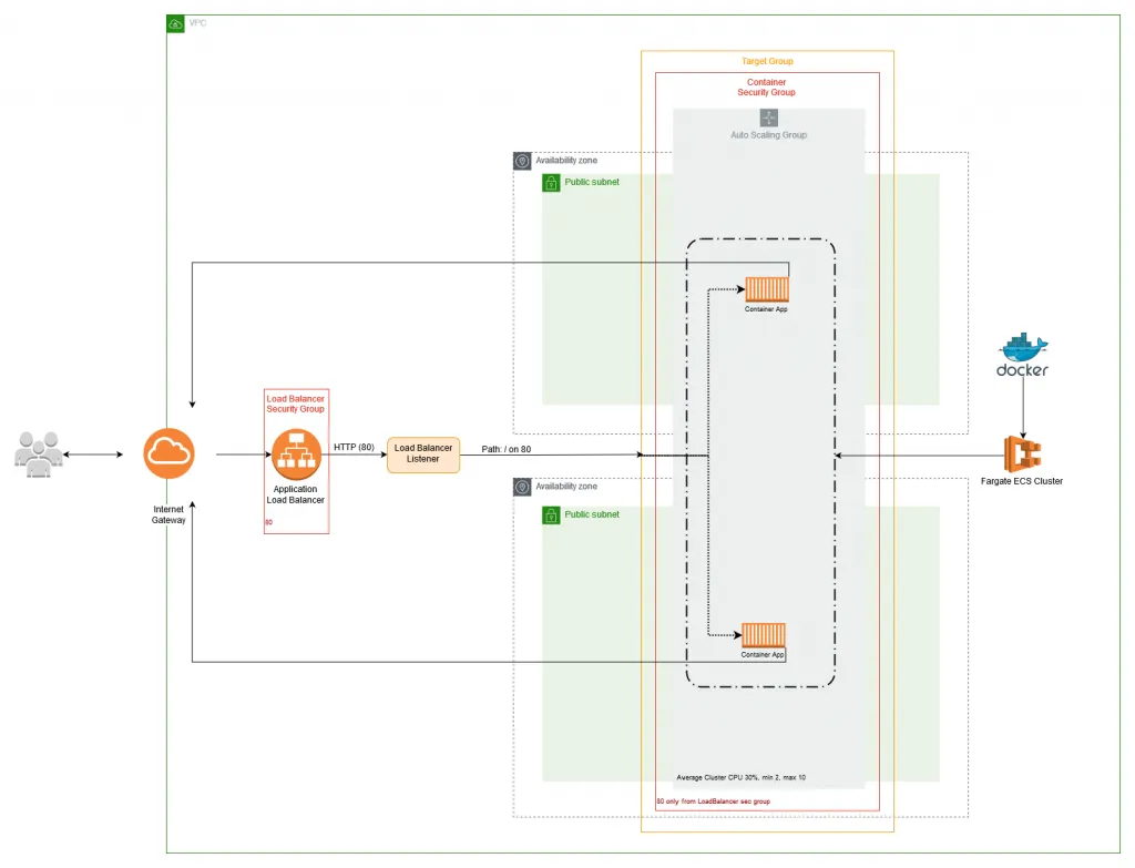 It resembles much of the same components as Elastic Beanstalk. The major differences being that; the applications run on containers orchestrated by ECS Fargate and that the application is a now created from a Docker image. Fargate also requires a load balancer to distribute traffic to the service, which is the grouping of individual Docker applications running that may scale in and out depending on demand.