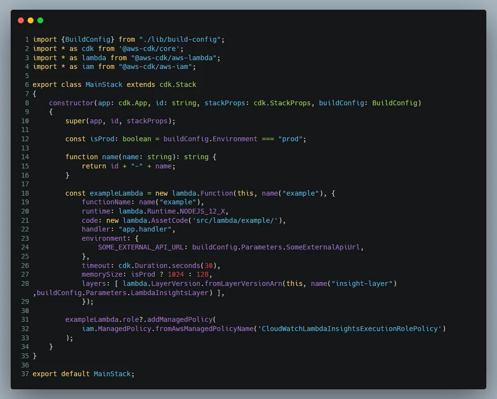 The MainStack (below) that we are deploying has a single Lambda in it, with a few ENV variables and the Lambda Insights Layer of which we all get from the config file.