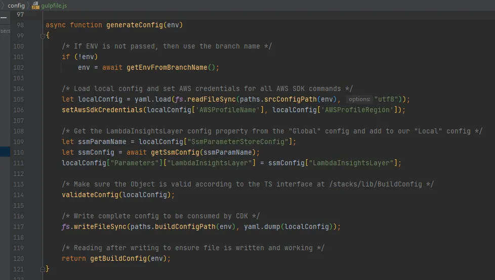 Notice that we don’t pass the environment in these commands and let it default to the branch name , with the exception that if on the master branch it uses the prod config. The getConfig(…) function within the GULP.js file allows for this to be passed down explicitly. This deployment method also works on CI tools.