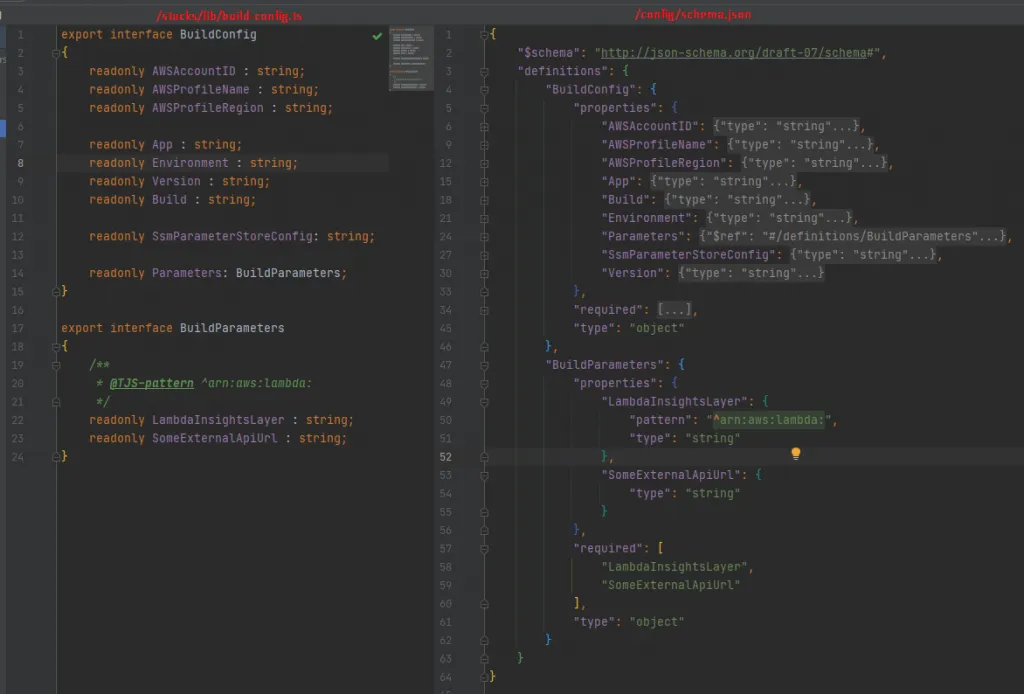 For this method we are using a slightly more advance approach. The AJV package validates a JSON object against the JSON Schema of our BuildConfig file. This way we can write a single schema file that defines rules like ensuring certain properties are set and start with the correct AWS ARN.