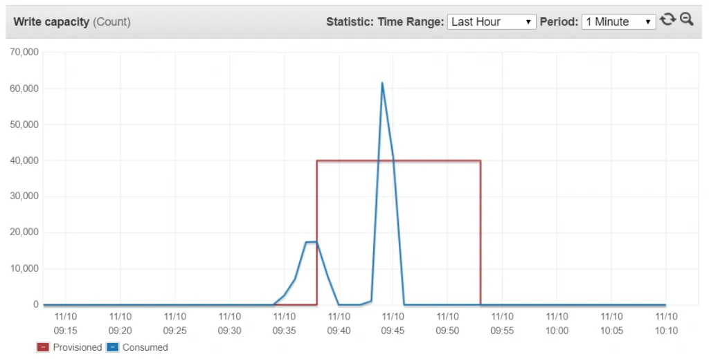 - The first time the tables WCU’s were scaled to 40k, it took about 1 hour to provision, I hope I didn’t get charged for that hour. After that switching between a lower capacity and back to 40k took about 1 minute.