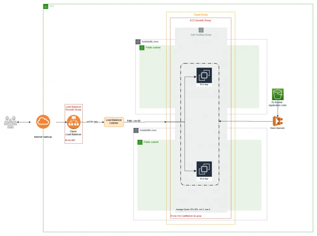 Important points to mention here is that you get a Classic Load balancer that balances over your subnets which could be either in public or private depending on your external VPC setup. Then Elastic Beanstalk creates all the Security Groups, Classic Load Balancer, Target Group, Autoscaling groups, etc.