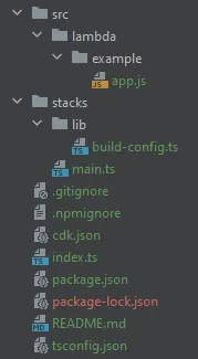 All stacks go into /stacks, the main CDK construct is on the root as index.ts and all application specific code goes into /src. The /src dir will have sub directories for things like /lambda, /docker, /frontend as long as it makes logical sense. Then not displayed here is the sometimes needed /build dir where the /src code gets built for production and stored. The CDK then reads from the /build instead of/src.