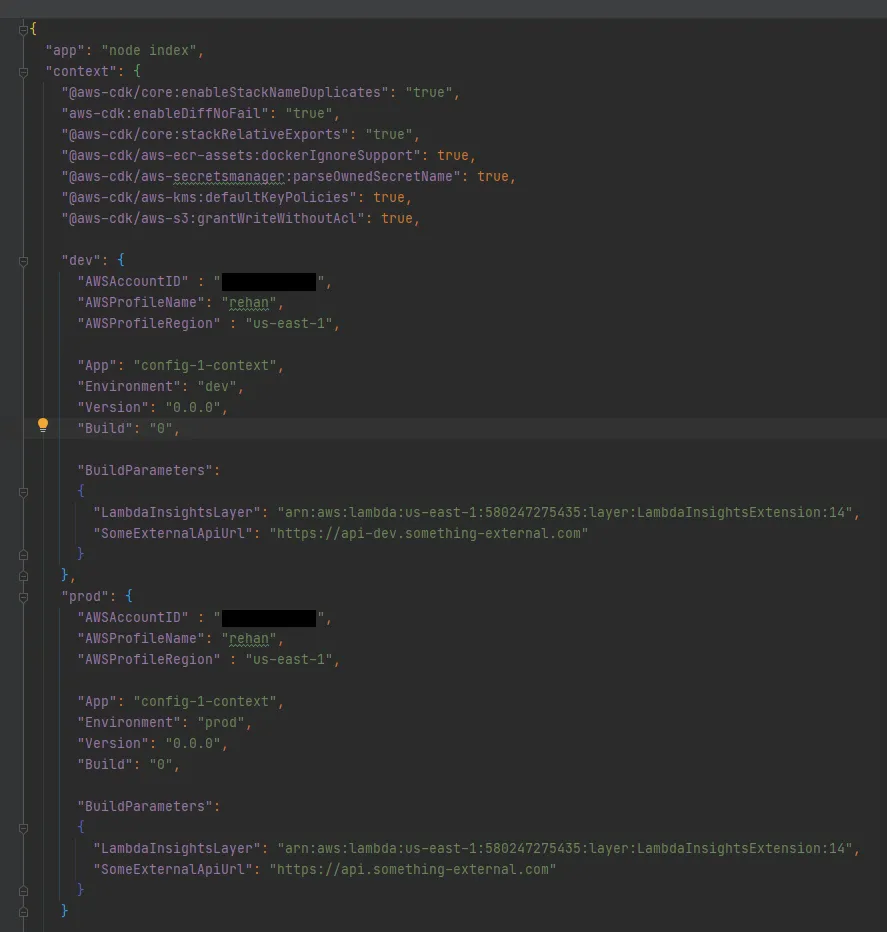 When you start a new project, every cdk.json will have a context property with some values already populated that are used by the CDK itself. This was my first pain point with using this method, it just didn’t feel right to store parameters used by the CDK CLI in the same file as my application configuration (opinionated). Note that it is possible to also store the .json file in other places, please check out the official docs (link above) for more info.