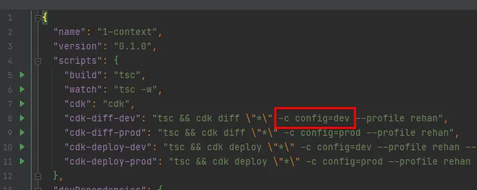 We are storing both development and production configuration values in the same file. Then when executing the CDK CLI commands we pass another context variable called config.