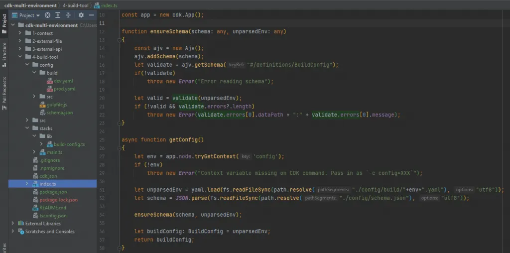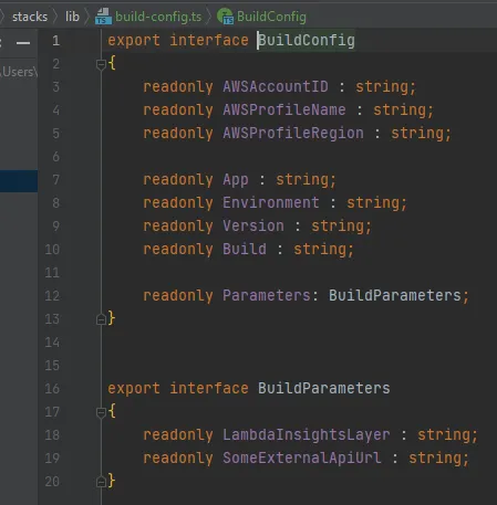 This is read within index.ts and it chooses one of the available environment configurations as defined in our cdk.json file. It is all done inside the getConfig(…) function, notice that we read each context value individually and assign them to our own BuildConfig interface, located at /stacks/lib/build-config.ts