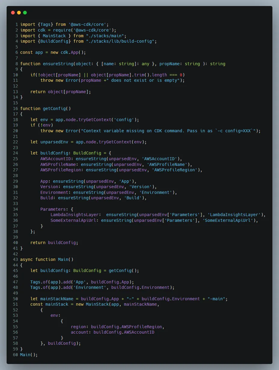 The MainStack (below) that we are deploying has a single Lambda in it, with a few ENV variables and the Lambda Insights Layer of which we all get from the config file.