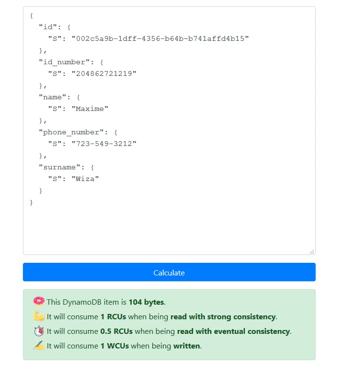 A single data record/row is kept small and fits within 1KB so that 1 record equals 1 WCU. This makes the tests and calculations easier. This is a nice tool that gives you the size of a single record as seen below.