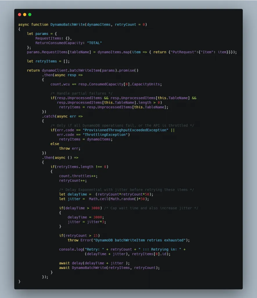- DynamoDB API Retries are set to 0 on the SDK client. This is so that we can handle partial batch throttles. This is done by adding the unprocessed items returned from the batch write call into an array and then calling the same batch write function recursively. This retry mechanism is hard coded to stop at 15 calls and to have exponential back off with a 50ms jitter between retires.