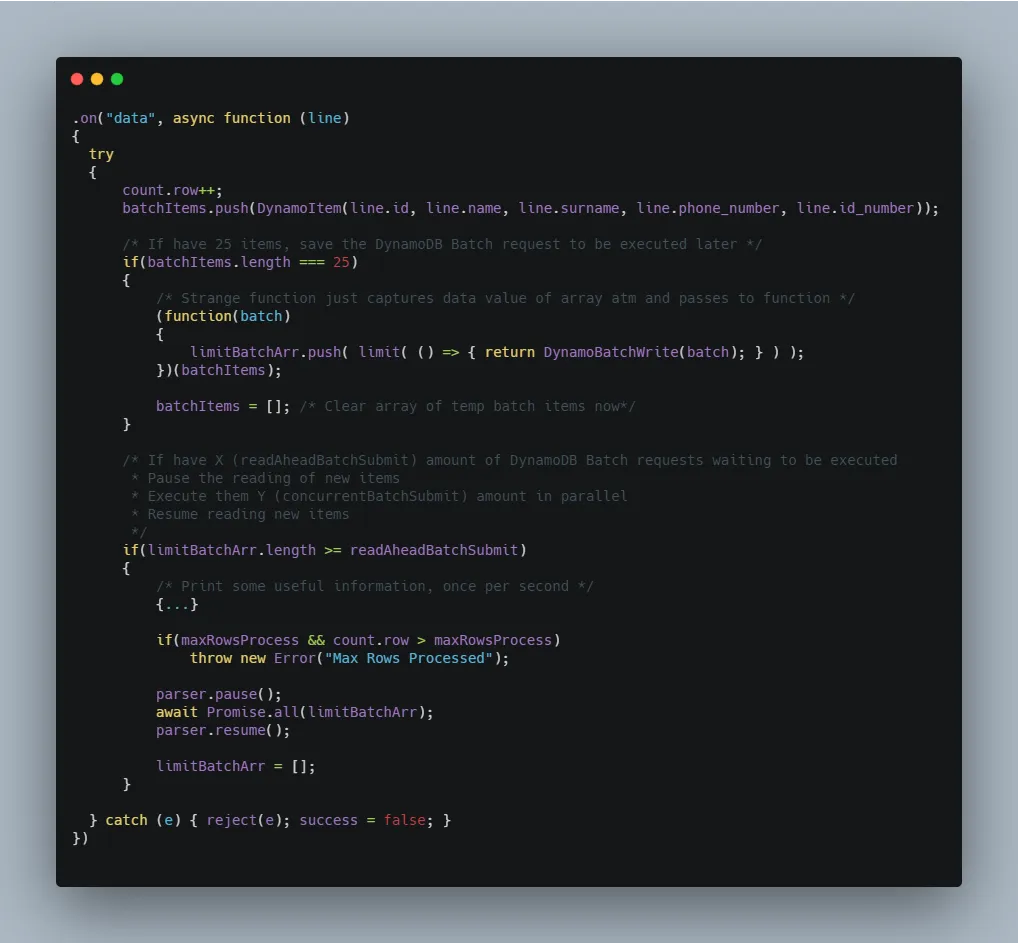 - Rows are read until 25 records are accumulated ; these are then used to create a DynamoDB batch write promise. X amount of DynamoDB batch write promises are stored in an array and will be executed in parallel but limited to only Y concurrent executions.