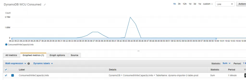 A single lambda running at full power (Memory = 3GB) can write 1 Million records into a DynamoDB table (first smaller spike on graph). Running a few concurrent lambdas, we can test the burst capacity of the table (right side larger spike).